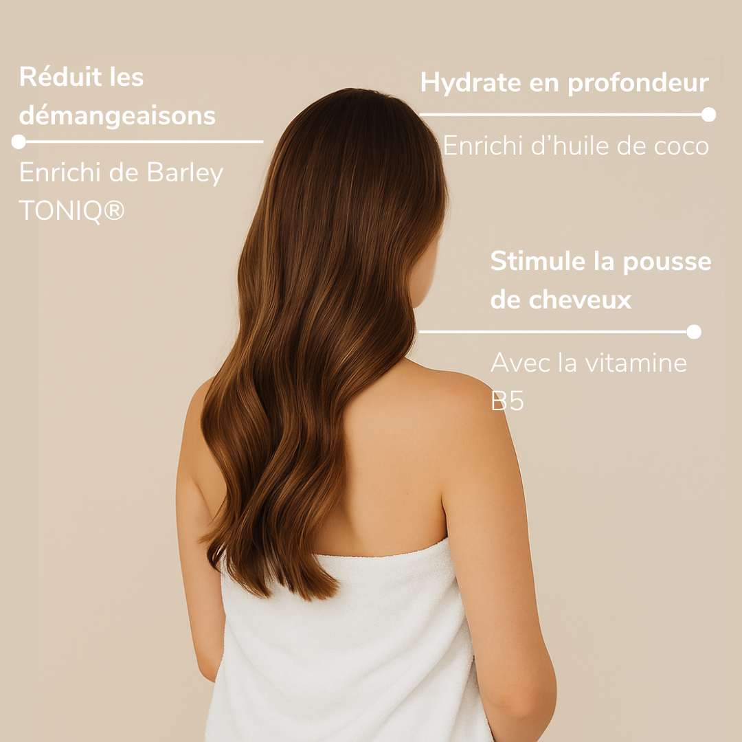 Notre formule, enrichie d'huile de coco, hydrate en profondeur, facilite le démêlage et révèle une brillance éclatante. Avec le Barley TONIQ®, dites adieu aux démangeaisons et rougeurs. Votre cuir chevelu retrouve confort et équilibre dès la première utilisation.